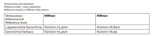 Sisävesillä syvyyksien vertaustasona käytetään kyseisen järvialtaan purjehduskauden alinta vedenkorkeustasoa (NWnav). Alikulkukorkeudet on ilmoitettu purjehduskauden aikaisesta ylävedestä (HWnav). Uudistuksen myötä sisävesikartoilla vertaustaso ilmoitetaan N2000-korkeusjärjestelmässä, aiemmin sisävesillä käytetyn NN (normaalinolla)-korkeusjärjestelmän sijaan.